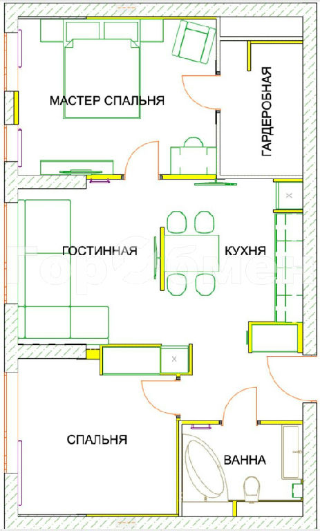 2 спальни, гостиная, кухня с обеденной зоной, гардеробная.